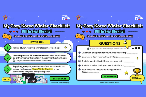 Terms and Conditions: My Cozy Korea Winter Checklist: Fill in the Blanks! ❄️✨ My Cozy Korea Winter Checklist: Fill in the Blanks! ☃️💙 Ready to embrace the excitement of traveling to Korea this cozy winter? ✨ Share your dream winter experiences and must-haves, and stand a chance to win amazing gifts, from skincare goodies to exclusive KTO merch! 🎁 ❄️ How to Join: 1️⃣ Follow @KTO_Malaysia on Instagram or KTO Malaysia on Facebook. 2️⃣ Like this post ❤️ and fill in the blanks with what you’d love to do or try in Korea this winter in the comments below. 3️⃣ Tag @kto_malaysia, mention two friends, and include #KoreaWinterChecklistWithKTO in your comment to complete your participation. 💡 Keep your answers short and simple for each question! 🏆 Prizes up for grabs: 🎁 Innisfree Skincare Set × 4 Winners 🎁 Laneige Skincare Set × 4 Winners 🎁 MNH Beulpingi Cushion Blanket × 6 Winners 🎁 JOGUMAN Mini Carry Bag × 8 Winners 🎁 KTO K-POP Box × 10 Winners 📅 Contest Period : 14 - 25 November 2025 📢 Winner Announcement : 28 November 2025 Need some inspiration for your answers? 💭 Check out Trip.com for exclusive winter travel deals! from snowy escapes in Gangwon to cozy retreats in Jeju! Book your Korea winter getaway now and enjoy up to RM60 OFF ❄️✨ 👉 bit.ly/CozyKoreaWinter (Link in bio) #KoreaWinterChecklist #KTO_Malaysia #VisitKorea #VisitGangwon #gogogangwon #VisitJeju #WinterInKorea Campaign A: My Cozy Korea Winter Checklist: Fill in the Blanks! Contest Terms and Conditions 1. The 'My Cozy Korea Winter Checklist: Fill in the Blanks! ' Contest (the “Contest”) will run from 14 November to 25 November 2025 (12 Days). 2. The Organiser reserves the right to amend the contest period at any time without prior notice. 3. Korea Tourism Organization Malaysia (the “Organiser”) reserves the right to disqualify any Participants without notice at any point of the Contest or after should he/she be found to have not fulfilled the prerequisites of the Contest prior to participation. 4. To participate in the Contest, participants (the “Participants”) must be residing in Malaysia during the contest period. 5. For contest entry on Instagram and Facebook, participants need to fill in the blanks by commenting their answers in the comment section below. Like the post and follow @kto_malaysia on Instagram or KTOMalaysia Facebook. Tag @kto_malaysia on Instagram or KTO Malaysia on Facebook, tag two (2) friends, and include the hashtags #KoreaWinterChecklist in the comment section. Participants must keep their Social Media accounts public for submission viewing. 6. Each participant may submit multiple entries. However, each participant is only entitled to win one prize. 7. The Organiser reserves the right to disqualify, at its sole and absolute discretion, the eligibility of any participant and/or revoke or forfeit any prizes at any stage of the Contest if: • Entries submitted are incomplete or fail to fulfill any of the Terms and Conditions stipulated herein • There is a violation of any applicable laws or regulations. • For any reason whatsoever the Organiser has reason to believe that a participant has attempted to undermine the operation of the Contest in any way whatsoever, including but not limited to fraud, cheating or deception. 8. The contest will end on 25 November 2025, at 11:59 PM , and winners will be selected from participants who have fulfilled all contest criteria, through a random selection process. Winners will be announced on 28 November 2025 via their Social media (Instagram or Facebook) and contacted through Direct Message. 9. A total of thirty-two (32) winners (the "Winners") will be selected from participants who have fulfilled all contest criteria, through a random selection process, and follow KTO rules. Among them, sixteen (16) winners will be selected from each platform, Instagram and Facebook , to receive the following prizes (the “Prizes”:- • Innisfree skincare set - 4 Winner (IG -2, FB -2) • Laneige skincare set - 4 Winner (IG -2, FB -2) • MNH Beulpingi Cushion Blanket- 6 Winner (IG -3, FB -3) • JOGUMAN Mini carry bag - 8 Winner (IG -4, FB -4) • KTO K-Pop gift box - 10 Winner (IG -5, FB -5) 10. In order to respond to the participants’ entries or fulfill the contest mechanics, it may be necessary to ask for personal information such as the Participant’s name, contact number, delivery address, and email address details. 11. In the event that the Organiser is unable to contact a winner within 2 day working days from the date of the Instagram Direct Message, the Organiser reserves the right to select another winner based on the judging criteria. 12. The Organiser’s decision on matters relating to the Contest (including, but not limited to the selection of the Winners) shall be final and absolute. No discussion, correspondence, enquiry, appeal or challenge by any of the participants in respect of any decision of the Organiser shall be entertained. 13. The Winners can pick up prizes at Korea Plaza , Ground Floor, Menara Hap Seng, Jalan P. Ramlee, 50250 Kuala Lumpur from 3 December - 17 December 2025 , 10 am - 6 pm on weekdays, except for Public Holidays . Winners are to refer to KTO Malaysia's instagram page for any updates in operating hours. All unclaimed prizes will be forfeited. 14. The winner may also opt to have the gift delivered by providing complete personal details, including their name, contact number, delivery address, and email address for delivery purposes. The delivery fee will be covered by KTO up to RM20 . 15. The Organisers will not be held responsible for the loss or damage of the prizes. 16. Prizes are strictly non-negotiable, non-transferable, non-exchangeable and non-refundable. No cash alternative is available. 17. By taking part in this Contest, the Participant understands and accepts without condition that the Organiser may elect to use the Customer’s personal in