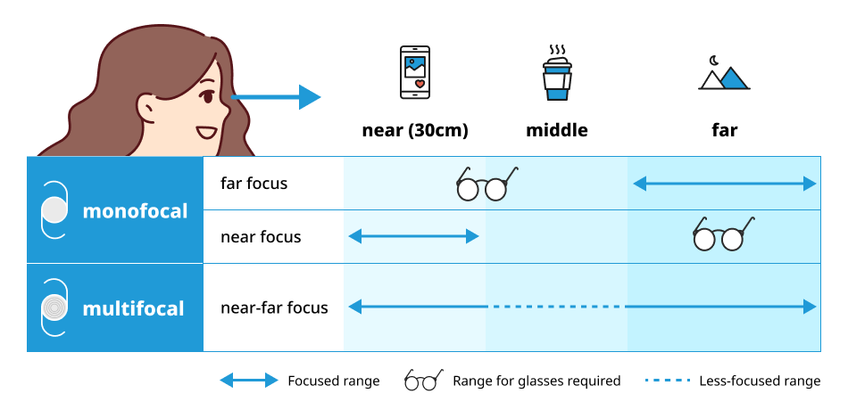 Lenses for intraocular use are categorized into monofocal lenses, which focus on either near or far distances, and multifocal lenses, which provide focus at all distances. Monofocal lenses offer high clarity with minimal light scattering, while multifocal lenses provide a broader range of vision. If a patient has both presbyopia and cataracts, a multifocal lens is recommended, as it can also correct presbyopia. Presbyopia correction using multifocal intraocular lenses is highly effective, with a patient satisfaction rate reaching 92%.1) Additionally, intraocular lenses can be used semi-permanently, as their vision correction effects are maintained unless vision deterioration occurs due to other ophthalmic conditions. However, patients with chronic or underlying diseases, such as hypertension or diabetes, may have an increased risk of visual impairment after cataract surgery. Therefore, it is essential to have a thorough consultation with a specialist and a comprehensive preoperative examination.